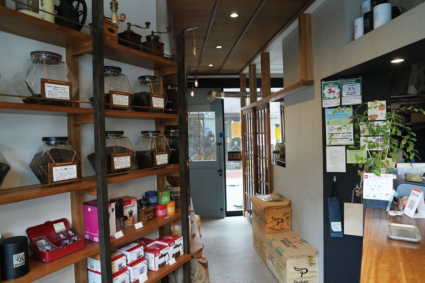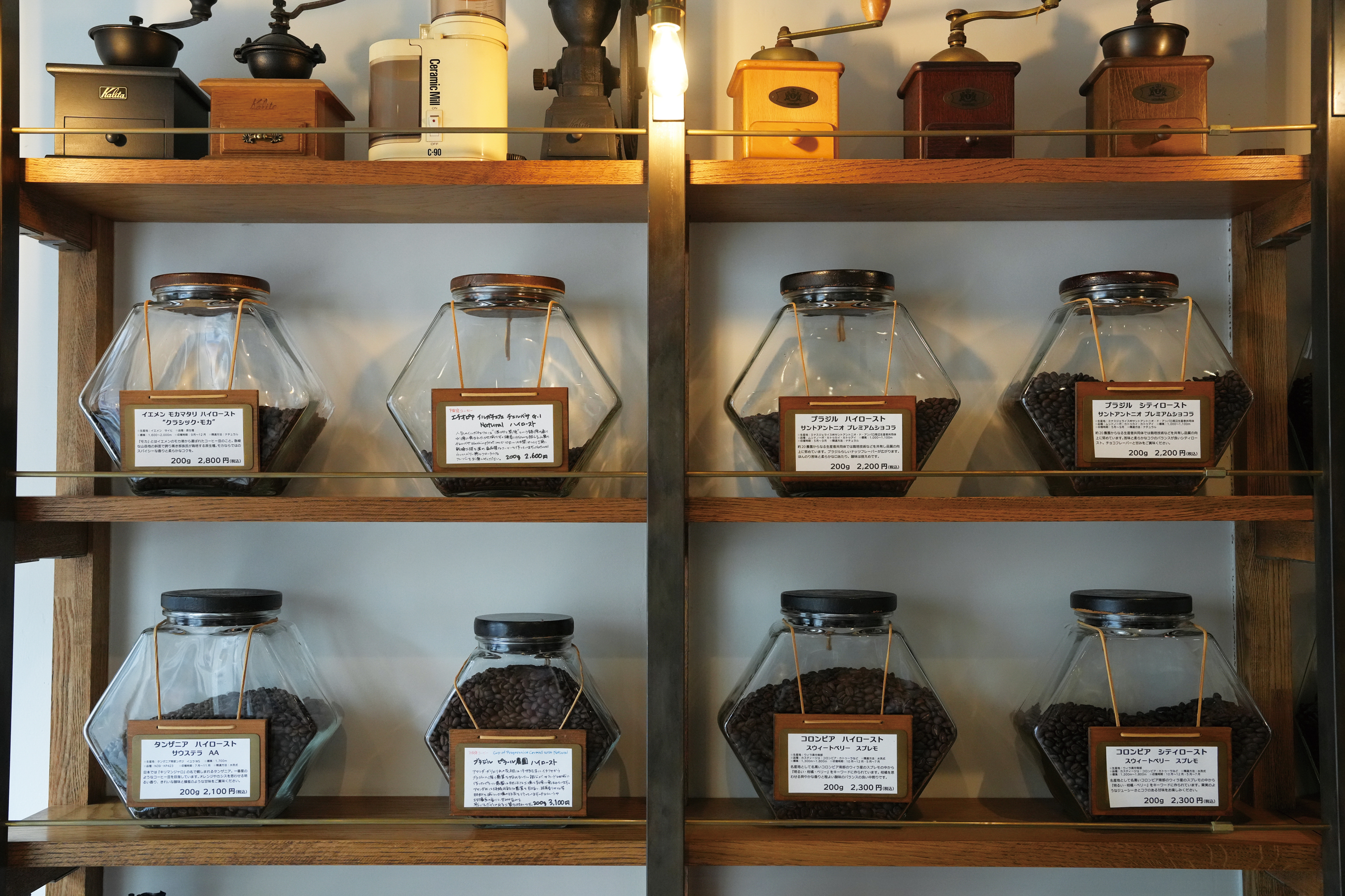 コーヒー豆は中煎り.深煎りで、ガラス容器に説明付きで壁面棚に陳列されています。月2回の限定販売や、3種類の豆をセレクトした頒布会も行われています。時にはオススメの豆を試飲しながら、店主との会話が弾みます。